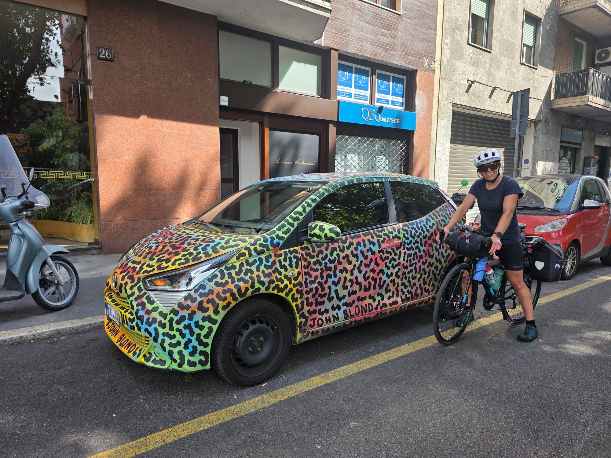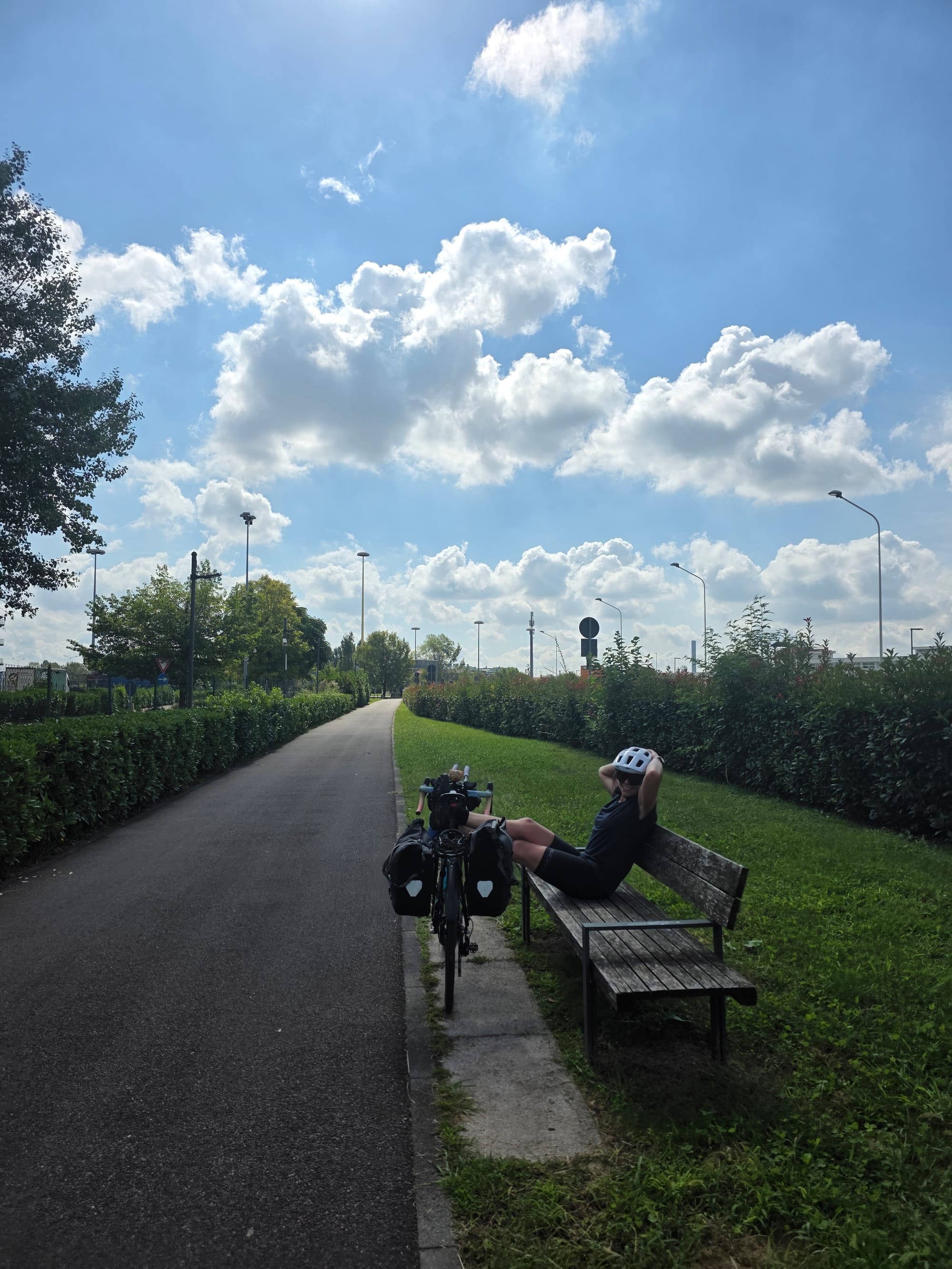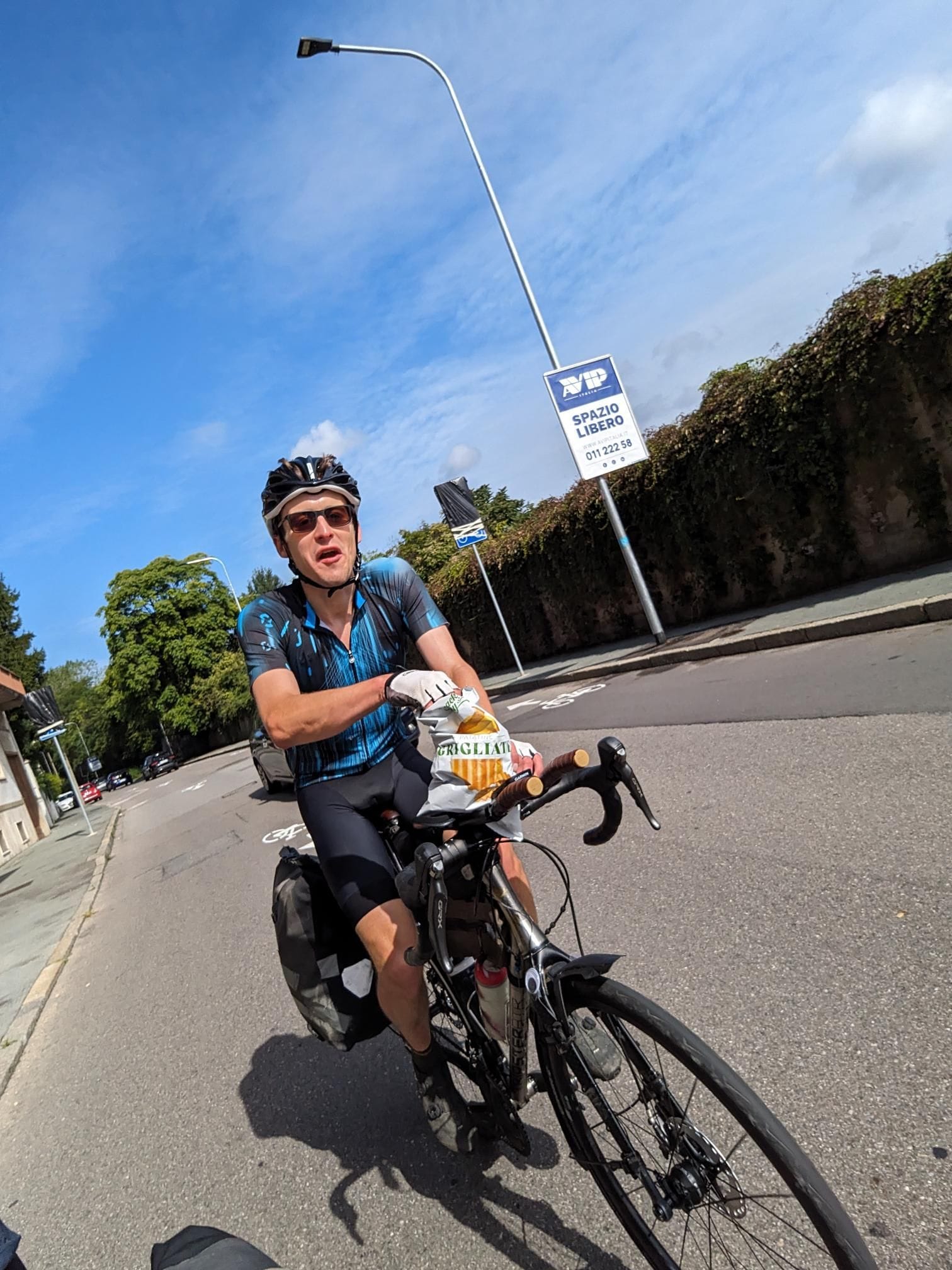 Our systems are definitely still setting up I'd say as we gave ourselves another 30minute extension on the leaving time this morning, but thats okay, there's plenty of time to get to military levels of efficiency in the next days/weeks/months. All being said we left at 09:40 this morning but with good legs and high spirits and plenty of food in the bags from our Lidl hit yesterday evening the 120 (200km) planned miles; our necessary daily average in Europe, looked well in hand. Turns out shops are open in Italy on Sunday so we pretty immediately stopped at a Decathlon to buy a better pump and for some quick gear indexing. Then we hit Milan and its traffic lights. Long story short, the miles, despite a nice tailwind, were hard won today as the distance travelled slowly crawled up.