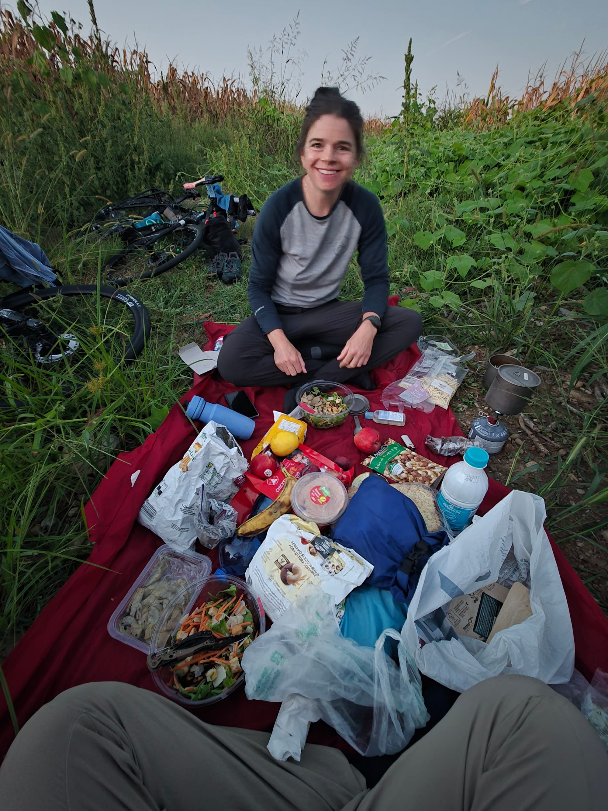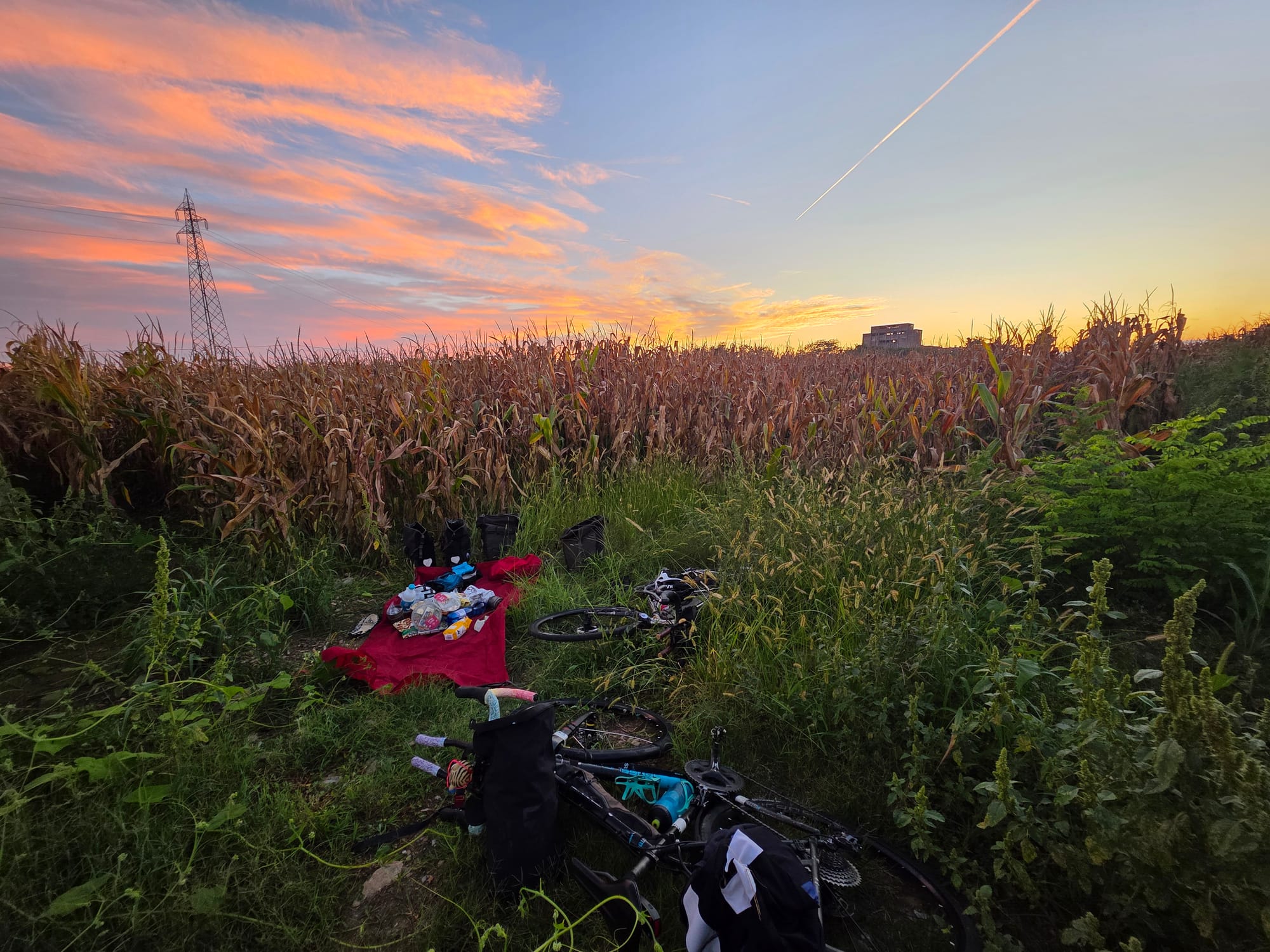 As the rest of the daylight cruised by into a beautiful sunset, we hit up another Lidl then set up in a maize field to unload our haul and have a bottle shower. Pretty reasonable day in the end, except the 18 mosi bites 🥴! Feeling the legs more than we should we concluded that accelerating with panniers is hard!