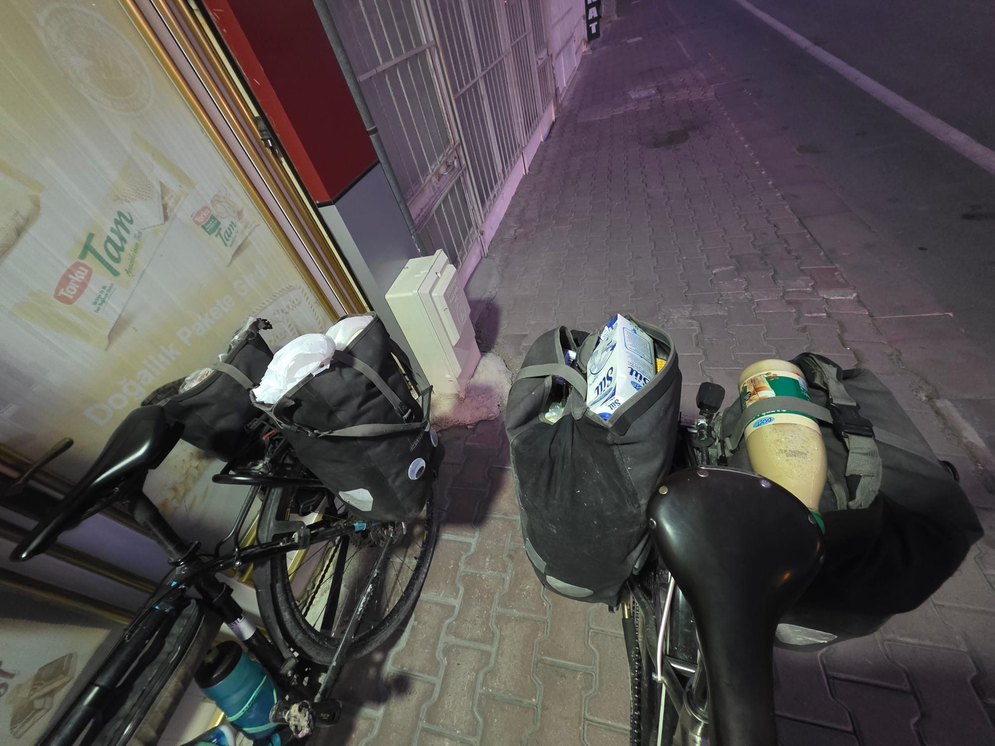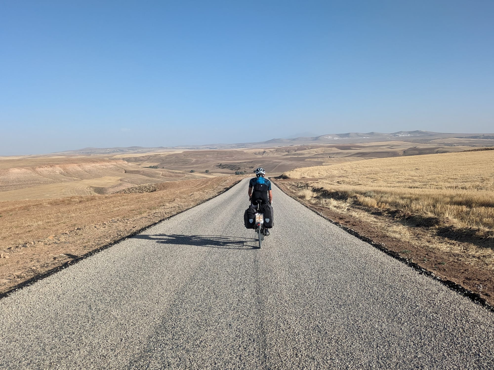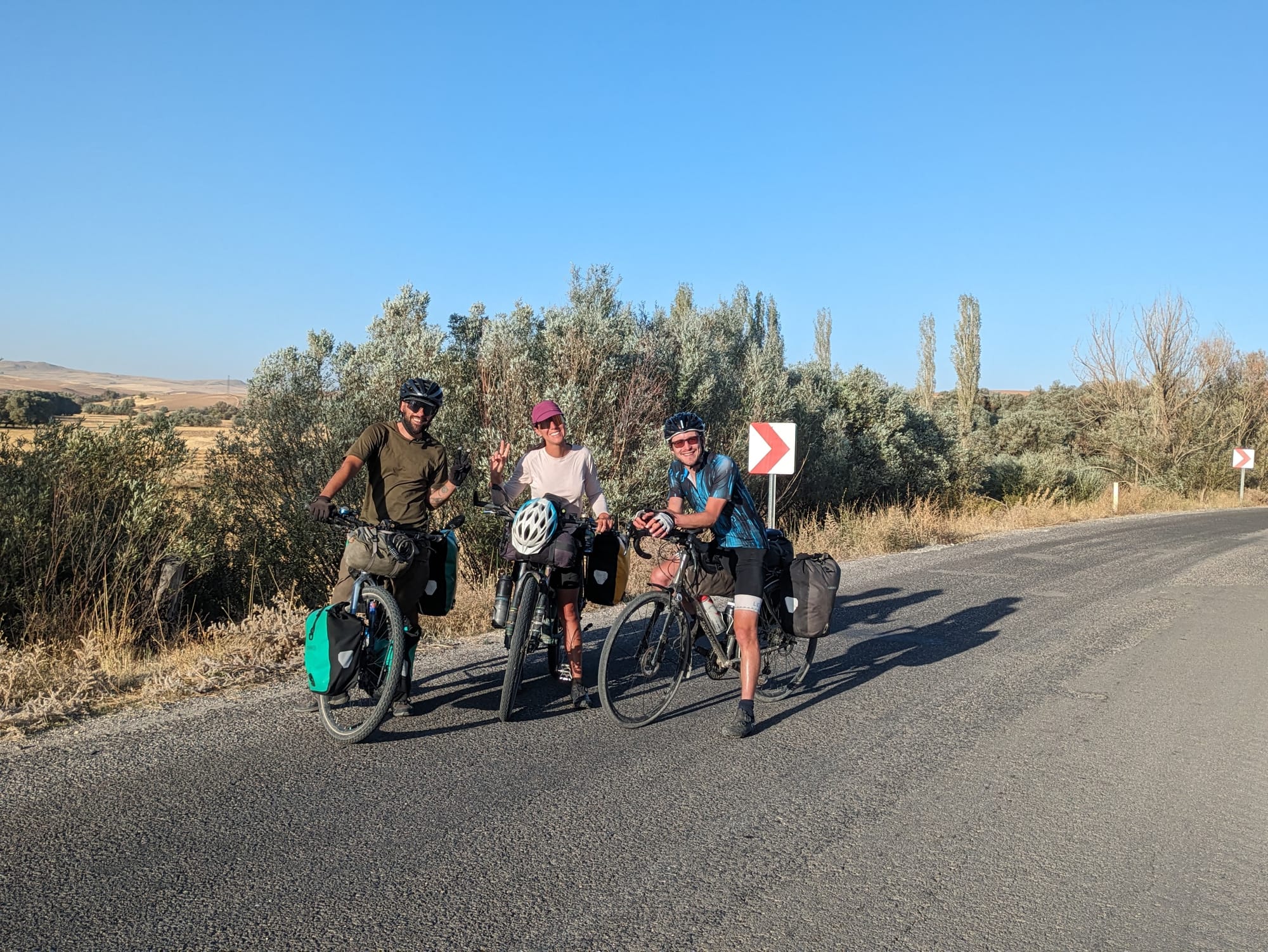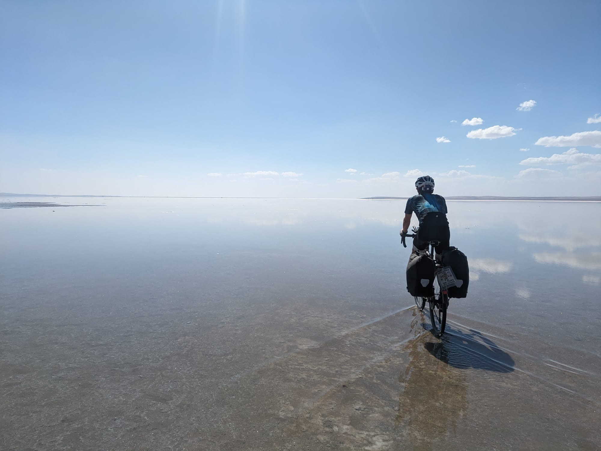 We bought a very overpriced cappuccino and enjoyed sitting inside out of the wind for a bit and charging Emma's battery pack which unfortunately doesn't seem to play nice with my dynamo. We ended up spending a while there looking at distances and plans for Cappadocia (the next touristy region), mostly whether to detour 60km to the biggest underground city or see the smaller one on route. After many options all of which started the same way anyway for the next 100km we got back on the bikes and headed away from the lake.