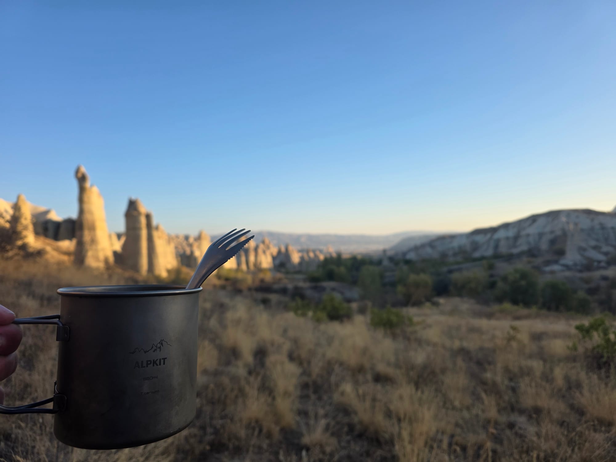 We awoke to the sound of thumping bass which was in stark contrast to the beauty of the surroundings. The bar on top of the valley edge had started up in preparation for the balloons. It's weird hearing cars drive up and voices nearby but knowing they're nowhere near you since they're on top of a cliff. We opened the tent zip with great expectations of seeing balloons low above the valley but there were none in sight and the music stopped shortly afterwards. It seems we were expectionally lucky to have had such a good show yesterday!