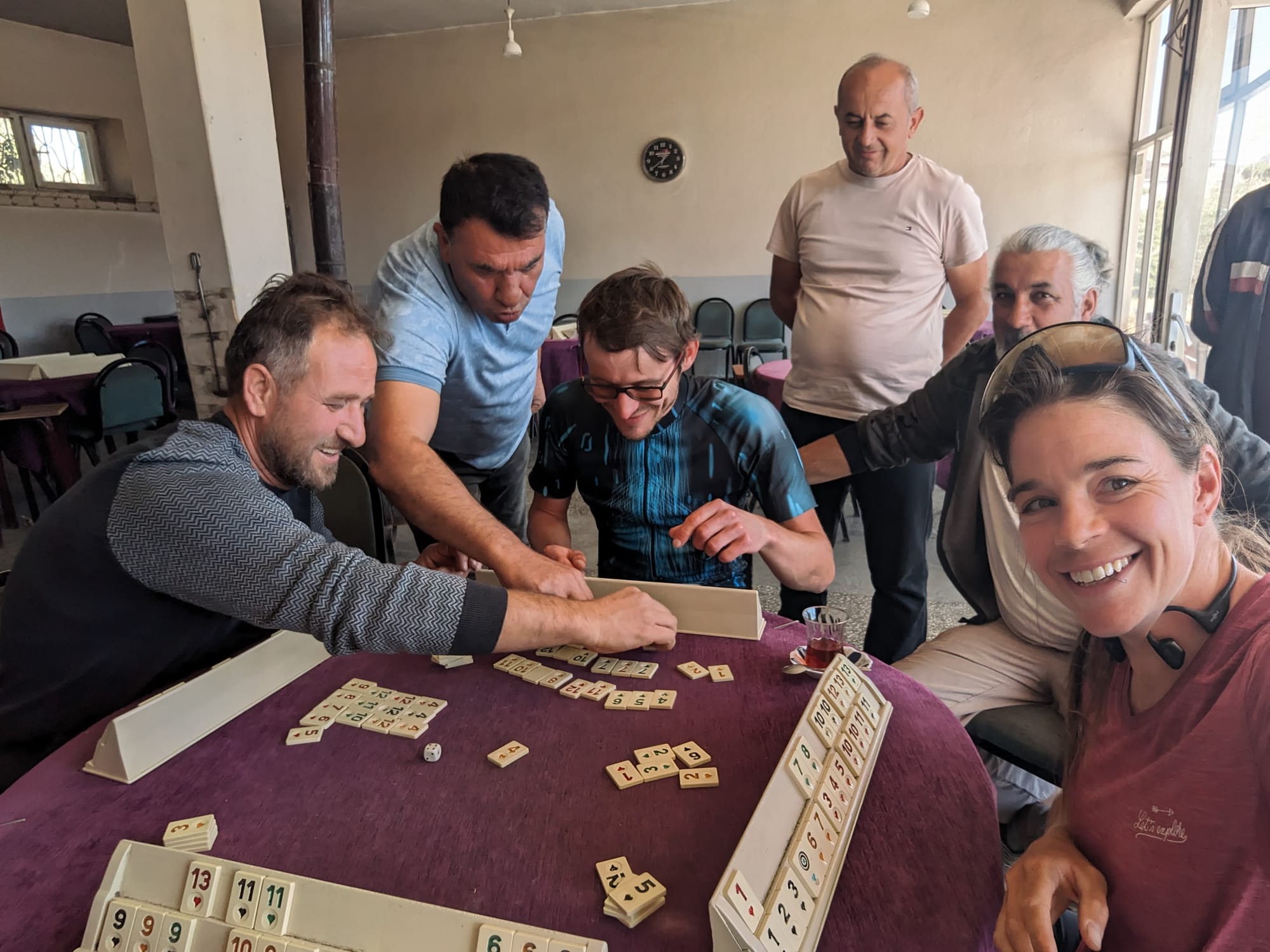 We were on a big road, and realised we would be unless we wanted thousands of metres of extra ascent and hundreds of kilometres extra distance. Normally, we'd be up for that, but it's a lot slower and every day we spend here is one less we have for seeing other countries, one day colder and one day of less daylight! Soon enough we came off into a small town to find water and snacks, and stopped at a water fountain in the village. Similarly to a couple of days ago when we ended up at a flat bread party, we saw some guys waving us over before we'd even had a chance to fill a bottle. We shrugged at each other - these water taps huh?! The cycling was kinda rubbish right then anyway and we went to say "hi". Very quickly we were chatting away in a village hall like place drinking first coffee, then tea, with the "village headman" (Mayor of the town) and his friends. There were perhaps 10 tables, all set up with Rummikub-looking games on it. Well, one thing led to another and they invited us for a game of "Okey". They played a quick round to show us the rules which was a furious and insanely well practiced click-clicking of tiles in very clearly defined but completely incomprehensible way, combined with helpful Turkish interludes to explain subtles of strategy.