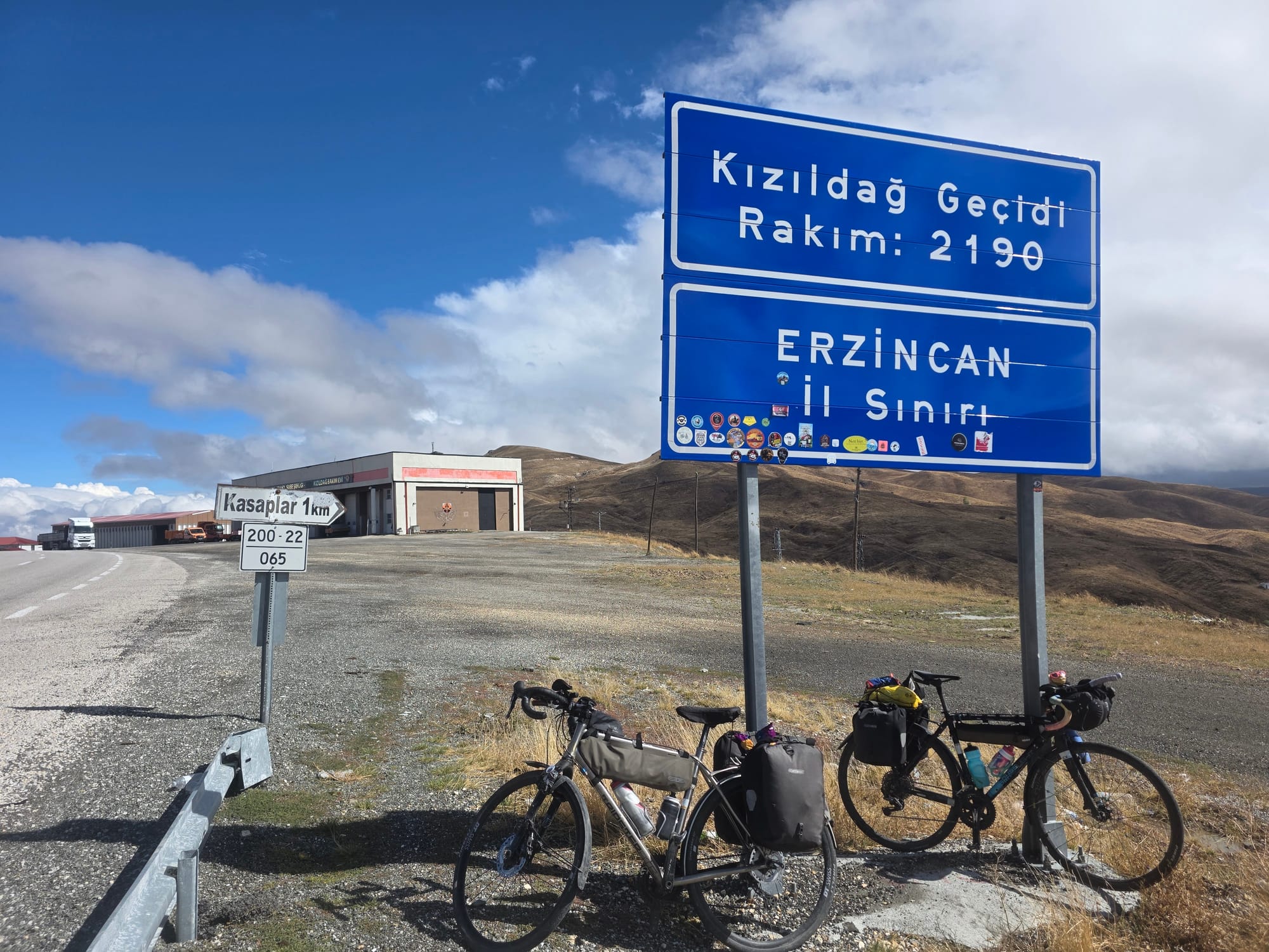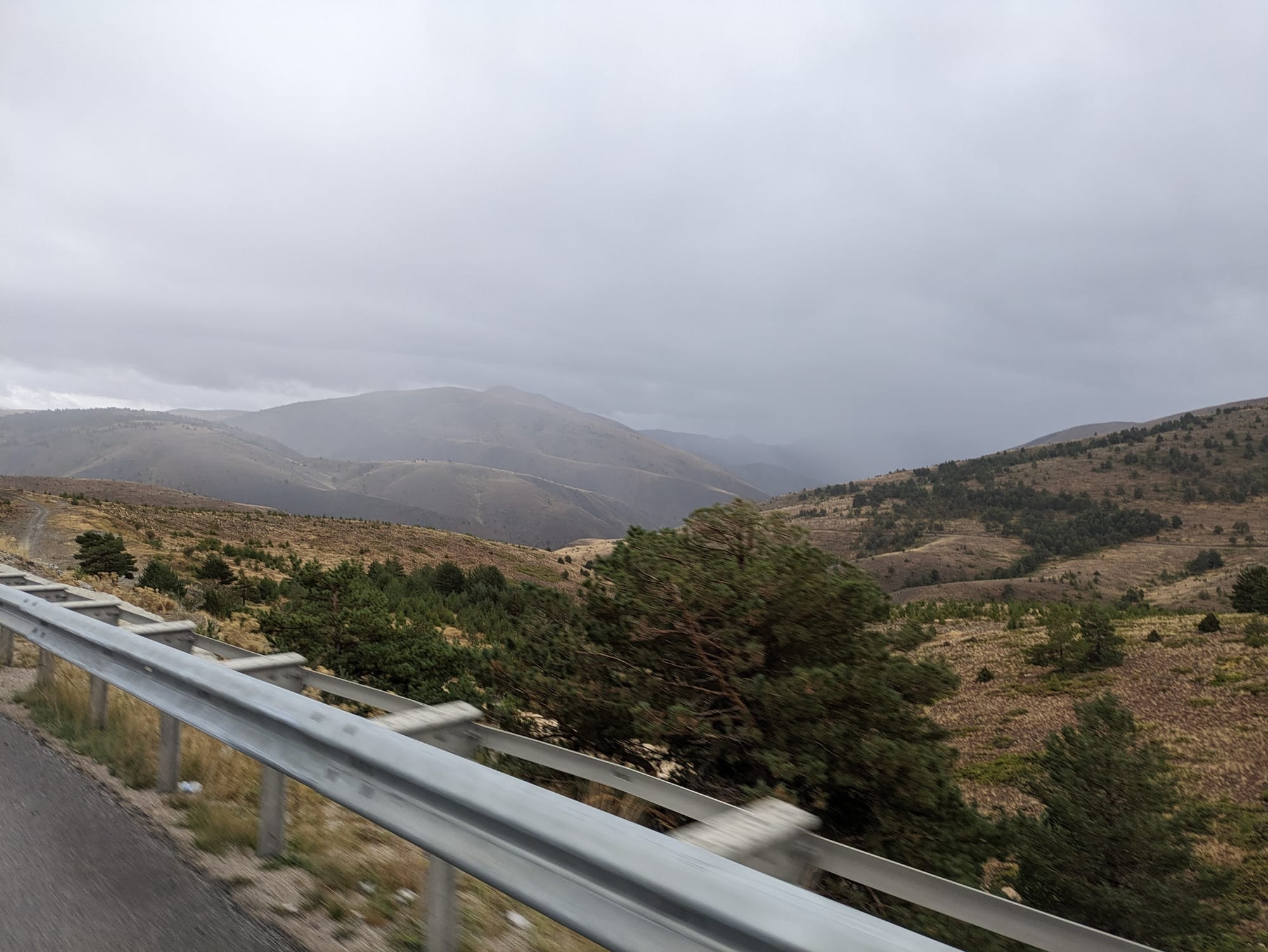 We woke to the sound of rain on the tent. That was expected as we'd braced for our first wet day of the tour. But as we hit the main road again (it was another 170km of dual carriageway today) the rain stopped and then the sun came out! Blessed, we continued through what felt like cycling through treacle on the rough road uphill until we'd smashed enough sugar to wake the legs up. Like a lot of sugar - I stopped at a shop for provisons and Emma kept on going. While catching her up, I had nearly two full bars of chocolate and half a packet of biscuits in the 30mins until I caught her, but the legs did indeed come online and soon enough the first pass was done.