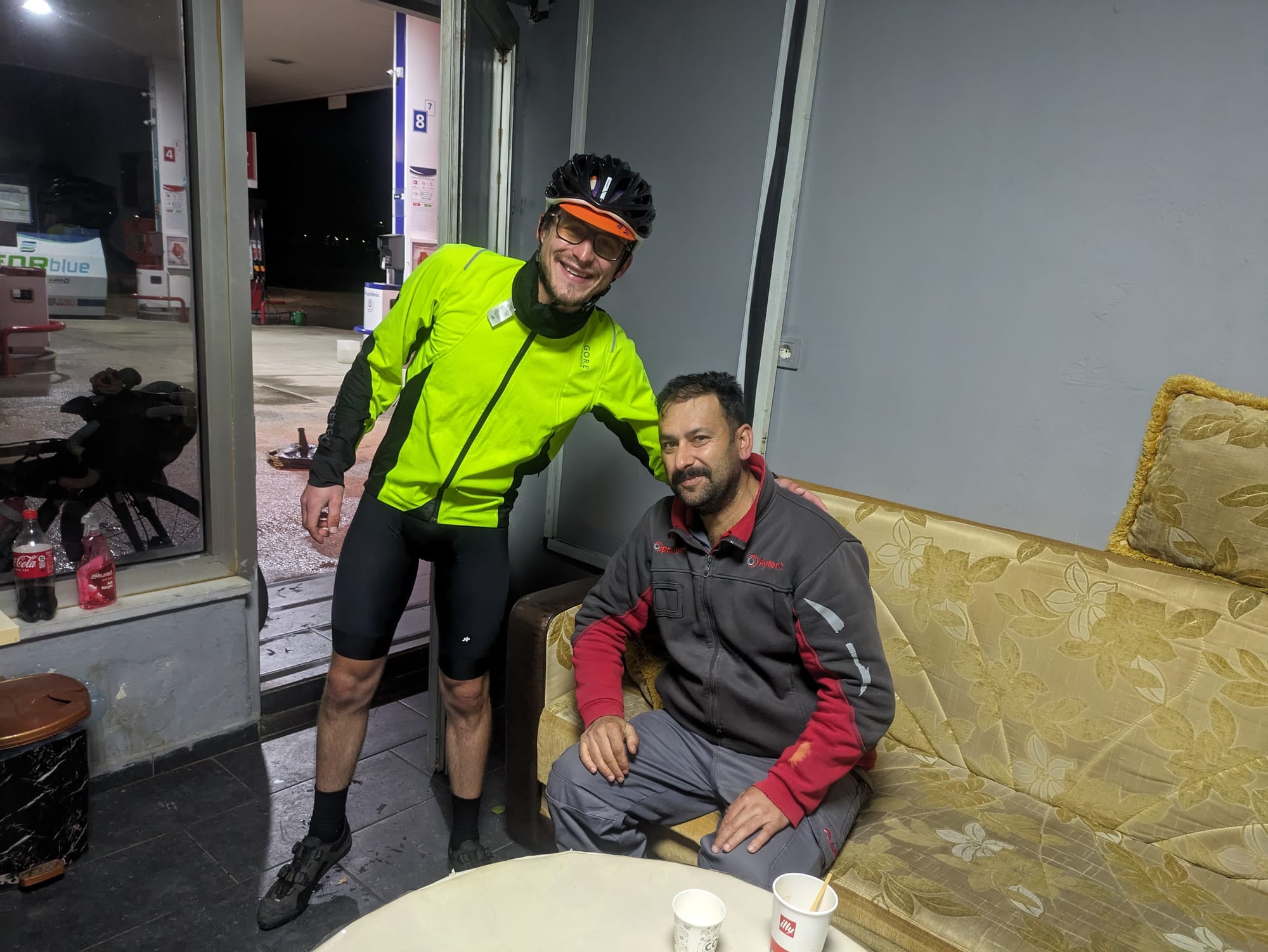 Eventually we got down and stopped at a petrol station to warm up. Shivering violently we were ushered into the back room and fed tea until we were warm enough to continue. It was more smoking inside but we weren't about to complain as he cranked the heat up for us!