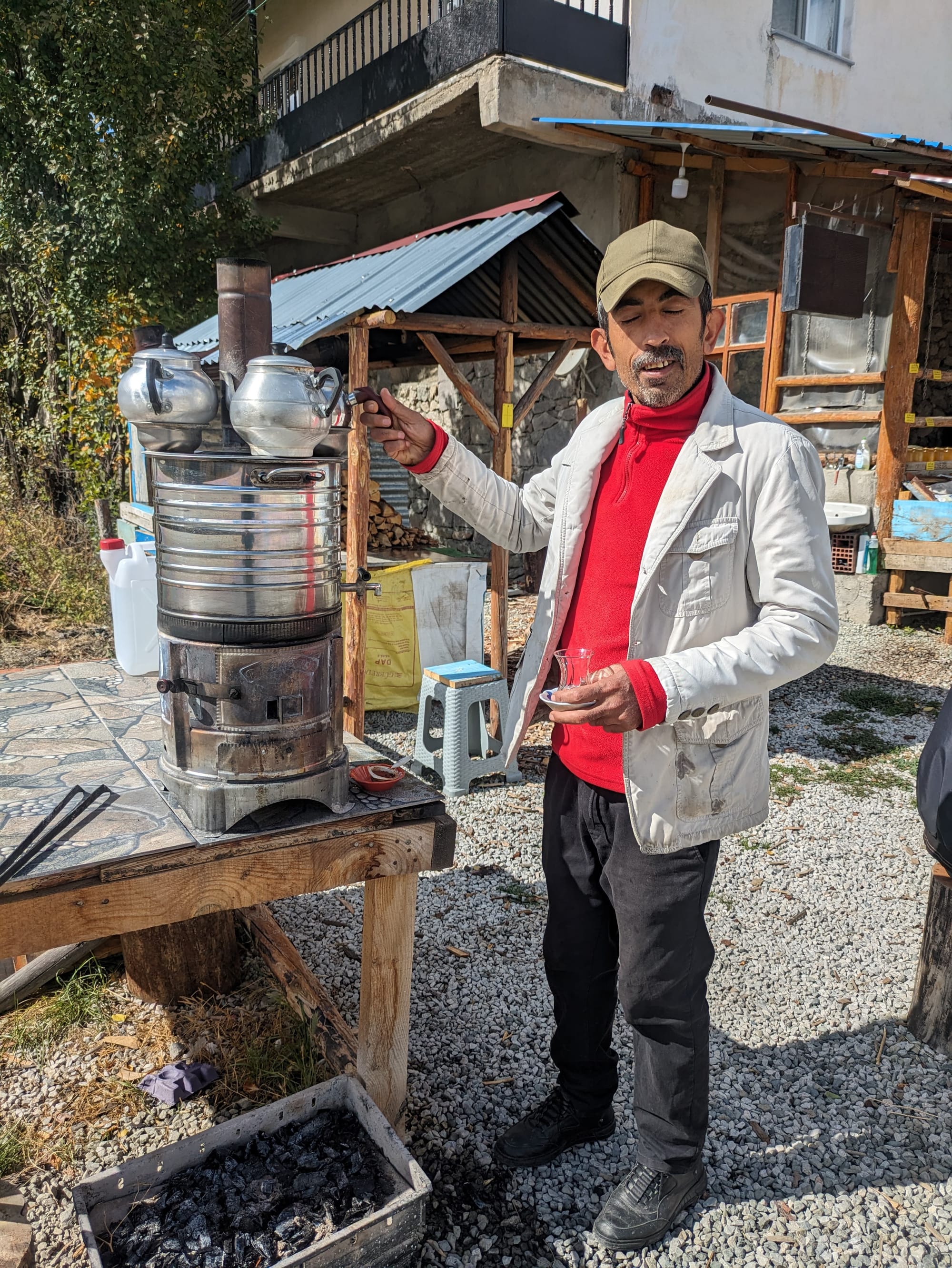 On the way down we stopped at a roadside tea station for a couple more teas each. A wood fired oven with big jugs of tea on it and nice tables was a fun vibe. As we finished the tea and set up to eat our lunch on his covered picnic table, the heavens opened. By the time we'd finished eating the sun was out again and the roads had dried. This cycling in the rain thing isn't so bad when you miss all the rain!