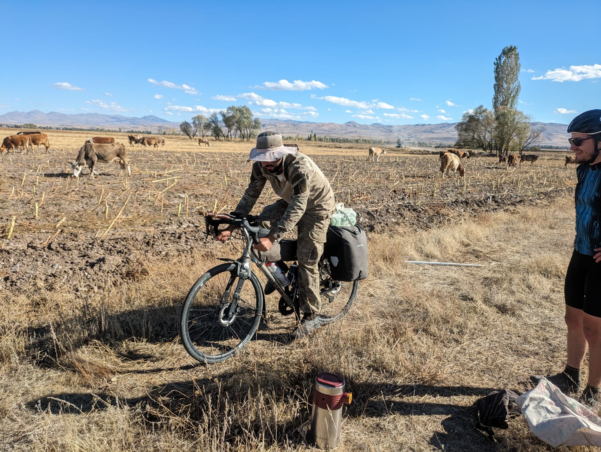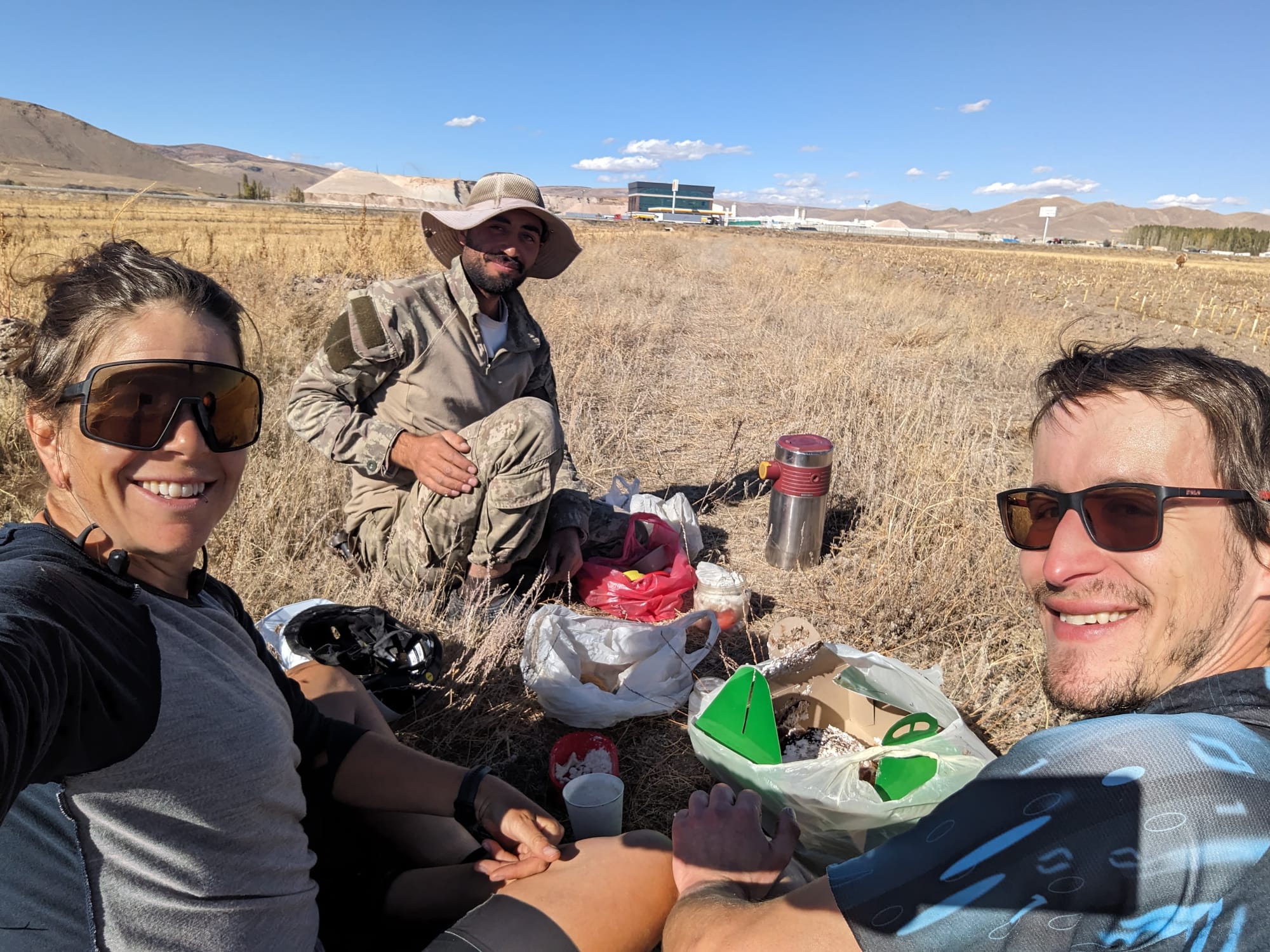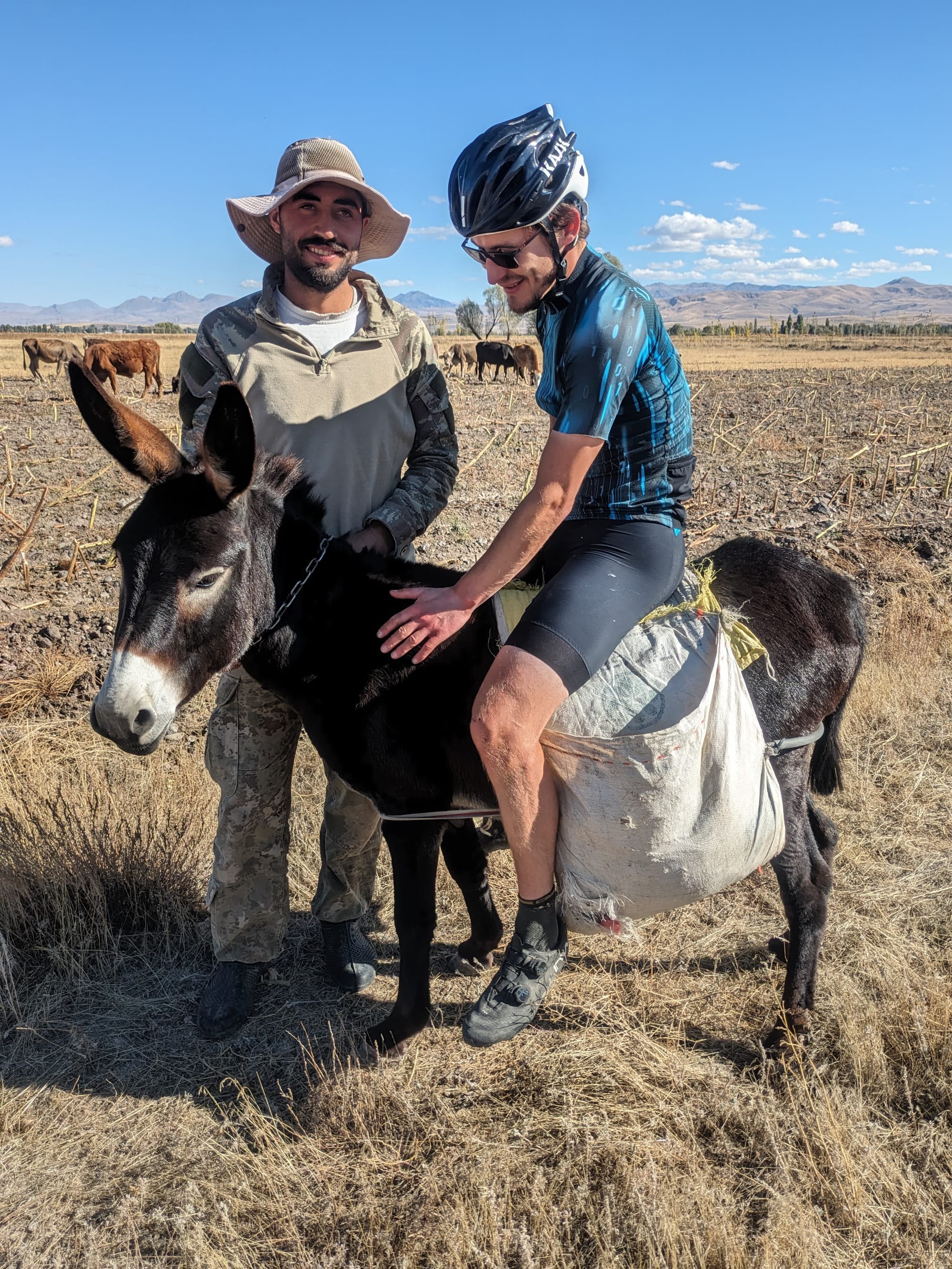 The next stop on the agenda was tea and cake. We hadn't exactly made 200km day progress thanks to the distractions, but in Turkey when a cow herd sees you on the road and runs across the field shouting "Chai! (tea)" you don't say no. He was very enthusiastic and we learnt a lot about his life while sharing tea and trying to eat enough of the food offered to not offend while not actually eating his modest lunch! We felt bad when sharing the cake that we felt was cheap, while he kept saying about how expensive it was, but we all enjoyed it and finally managed to give something back! Then he suggested I ride his donkey.