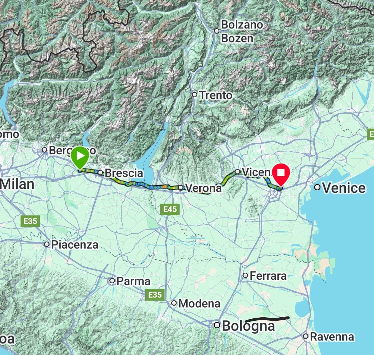 Not 3 days in and we've already fallen out and gone our separate ways! 😉 Emma realised a good friend was base jumping at the other end of Lake Garda and so diverted for a day on the train to go and watch. So after a great sleep (second night on the camping mats and we both clonked out, only waking up once) we got a very early start from our secluded wild camp and Emma set off for the nearby station. Meanwhile I put in my headphones, got my head down and found the trance-like state that reallt crunches through the miles, only broken when I was run off the road by a lorry passing so close I had to bail to the verge rather than get knocked off. With that exception the driving here has been generally very respectful, and they seem to understand that the cycle paths frequently just stop or are covered in pedestrians so don't mind cyclists on the road. Roads which today have been busy A and major B roads with a lot of towns, roundabouts and traffic lights. We're after progress not pretty in Europe, but looking forward to when we can take some more time and find the nicer routes.
