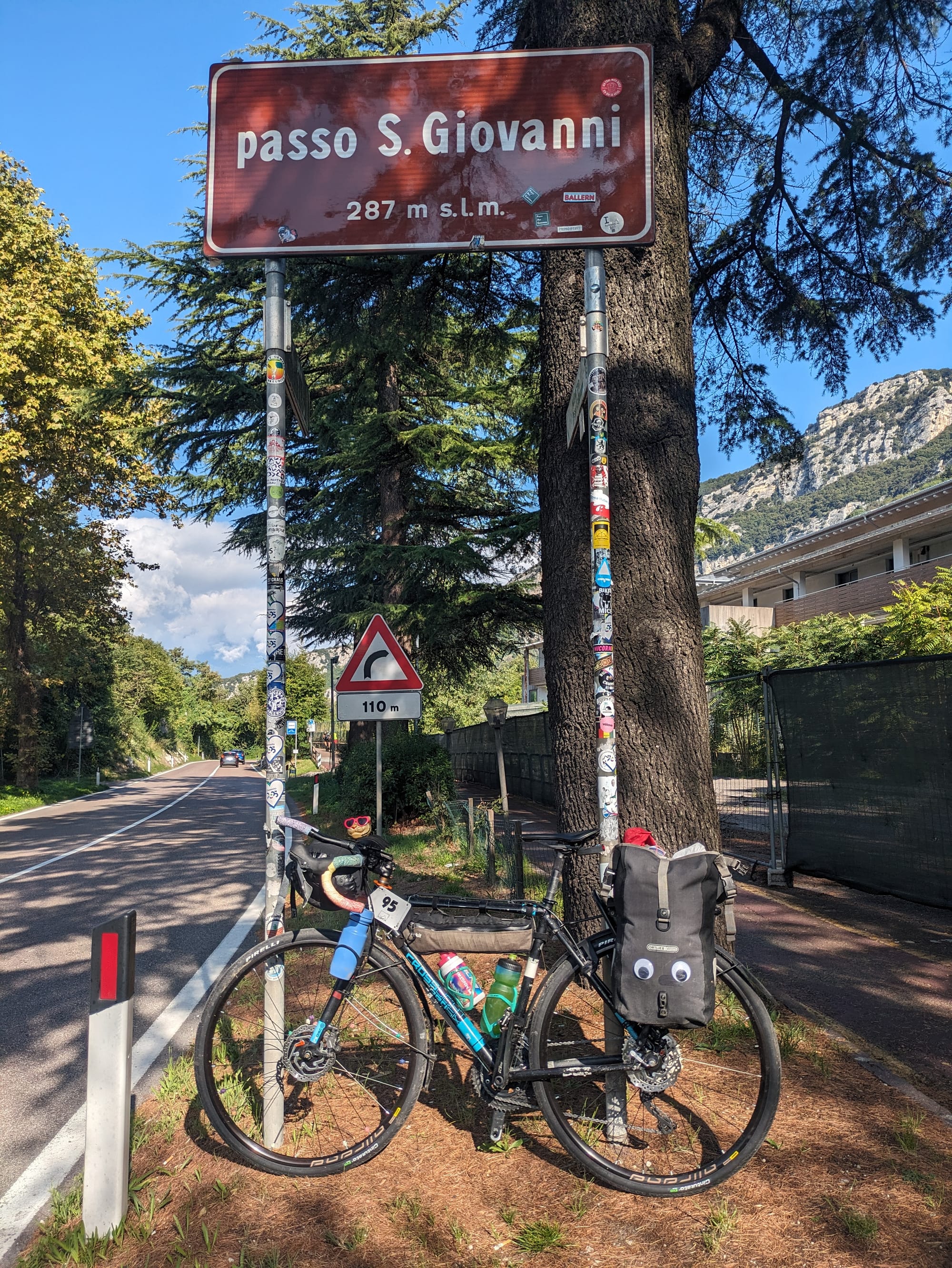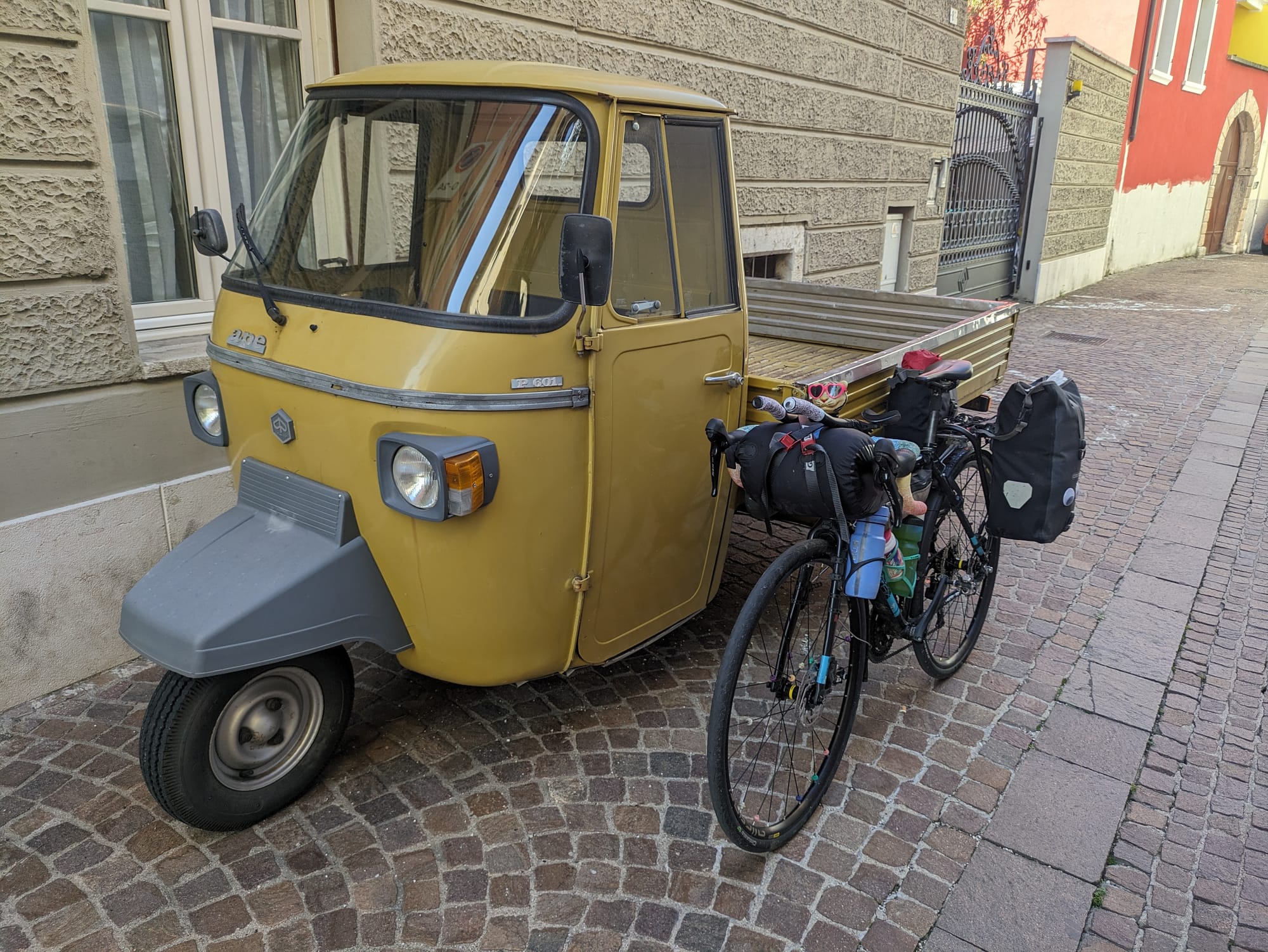 After starting with a comparatively "efficient" start (pushed only by the fact I had a train to catch) , I trained up to Rovereto (sooo much faster than cycling...) + 75km round trip cycle on some of the most heavily used cycle paths I've ever seen (great to see!); great cliffs; a bear drinking a beer; many classic 3 wheelers; and my first "pass" of the tour, I just managed to catch one of Ed's jumps, rediscover crema café (coffee + cream , semi frozen) and blast back to the train station to catch the train that was 1h delayed 😅.... Didn't even need to rush my gelato. Best compliment of the trip so far "lovely Cat" ....must be Tiges new glasses. 😍