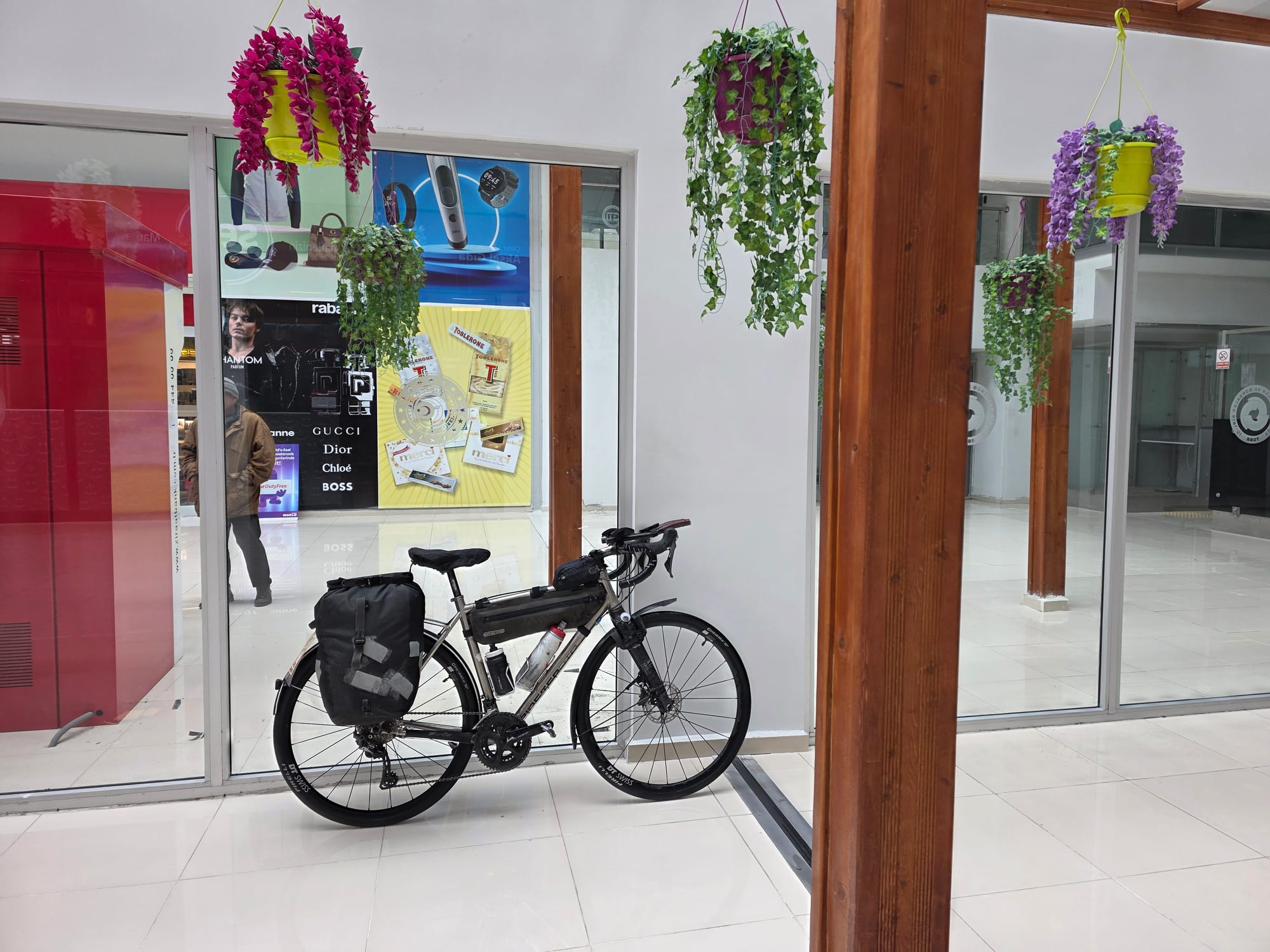 The first climb was on snowy roads. Again stunningly beautiful, but stunningly cold! Since Emma's happiness is directly correlated with the temperature, she wasn't having an amazing time I don't think (-2 degrees). To our amazement and great relief the border is a) indoors and b) has a cafe and shopping centre! Designed for cyclists! It is at 2000m elevation to be fair, but usually there's nothing so we were pretty chuffed. We had two rounds of meals and tea in "nomansland" and defrosted. The meals were expensive, but required, and we got a free pudding so we're npt complaining.