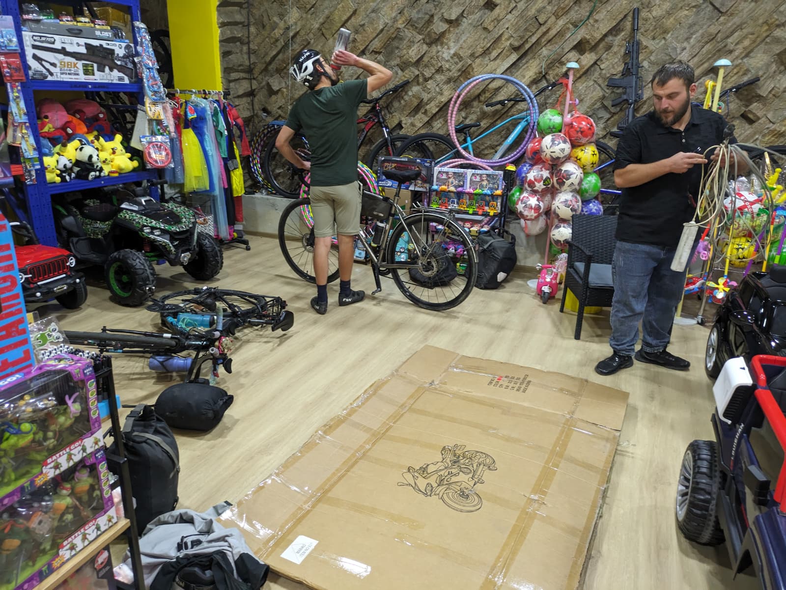 One chap with good English was chatting to us the whole time, and was very interested in bike tech, being a cyclist himself. After a while I asked if he works for the bike shop or the toy store. Neither, it turns out! He was just an interested party who knows the bike shop guy and doesn't work so had plenty of time π. Having a translator and extra pair of hands is very helpful, even if you have to multitask dissembling your bike and extremely nerdy discussions on component choices π .