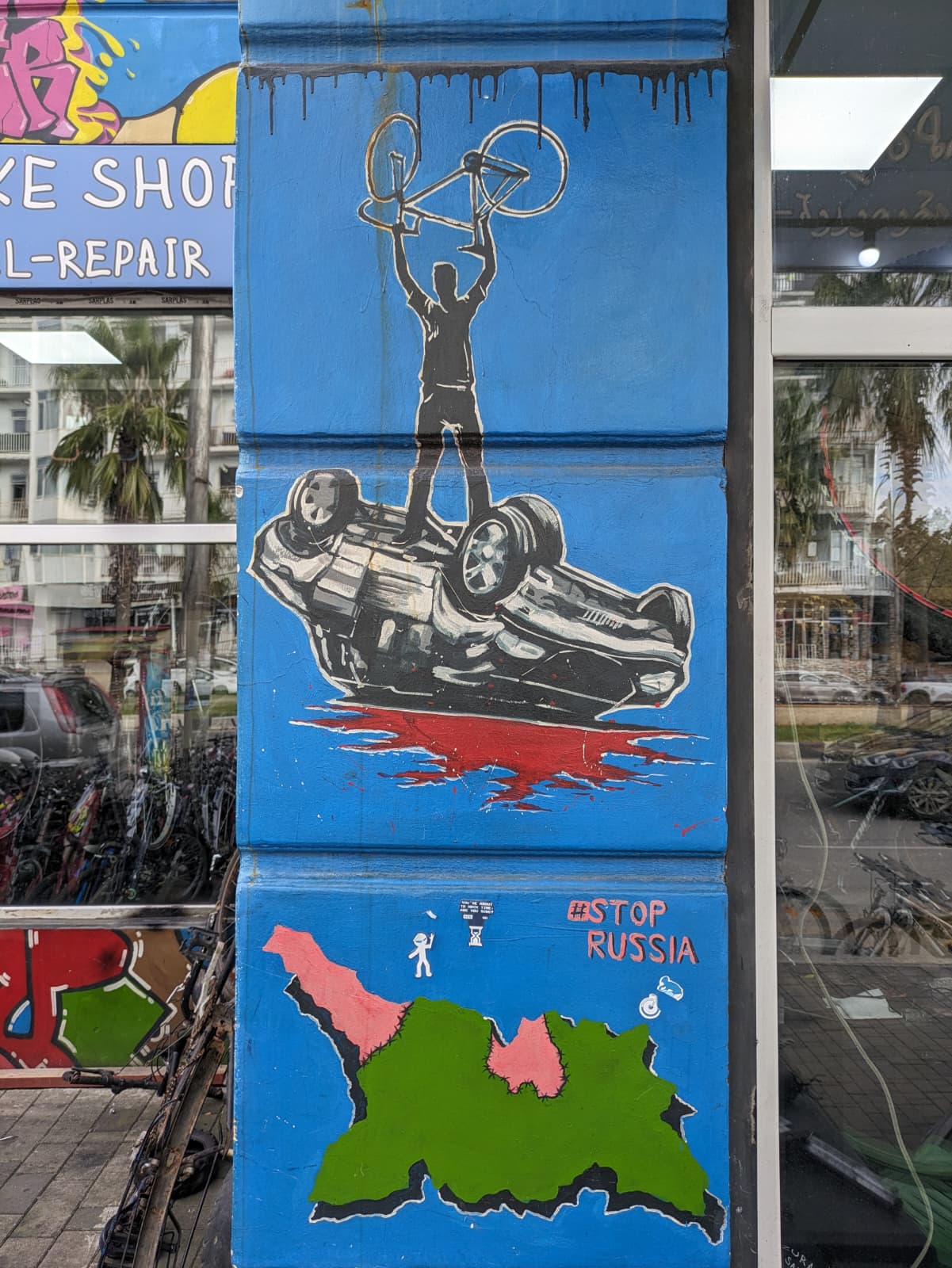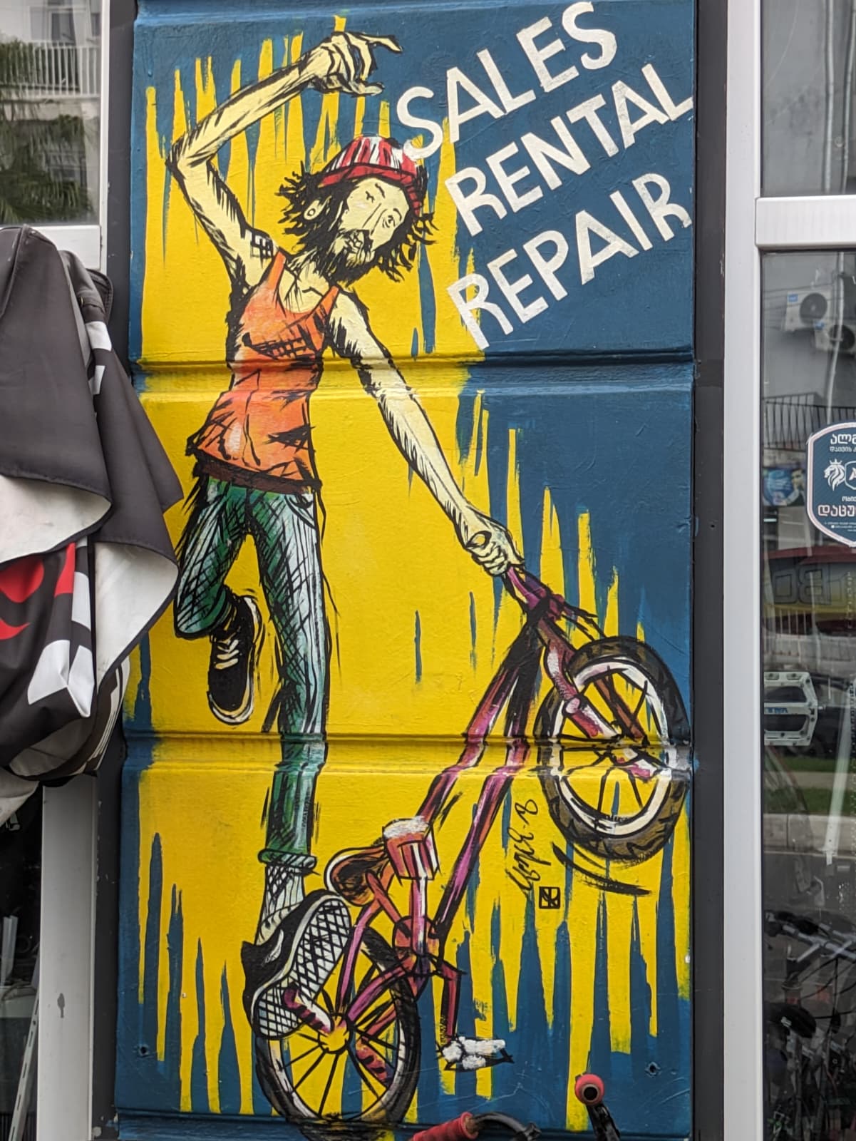To fly with a bike it needs to go in a box, usually with some dissembly required. There are a lot more tourists flying bikes in and out of Georgia than bikes sold in Georgia, so the usual system of collecting a bike box from a shop doesn't work. However, a very cool bike shop owner has worked out a great racket. He sent us to a toy shop selling those electric kids cars, where they have plenty of big enough boxes and soft packing materials. With the help of the bright lights and space in the shop and the tape they provided, packing the bikes was a joy. Then he arranges his mate to taxi the people and boxes the half hour drive to the airport! All for the very reasonable price of 48 euros for both of us!!! So once the bikes were packed we left them in the shop to be picked up the next morning and headed out to enjoy dinner, phaff done!