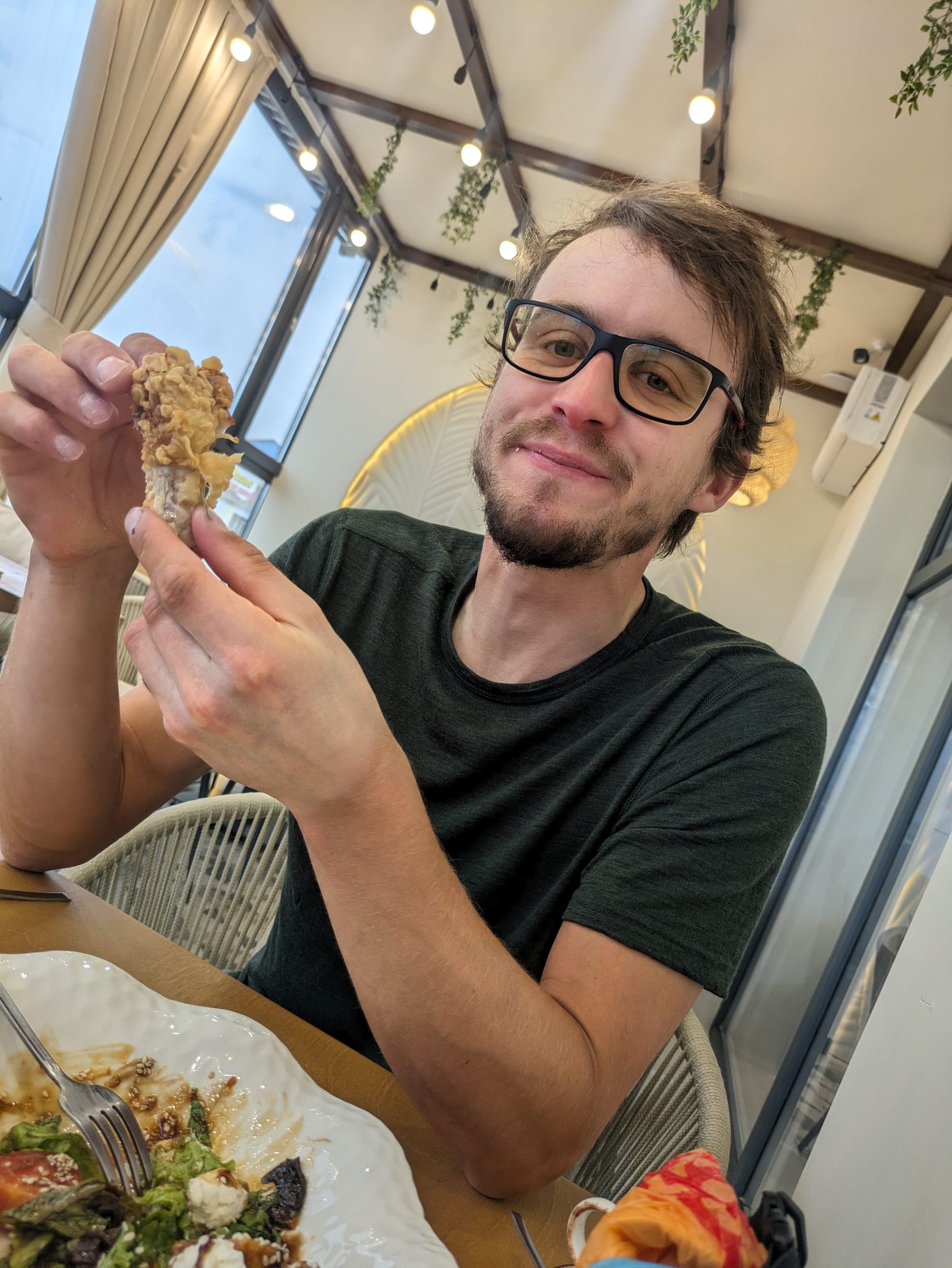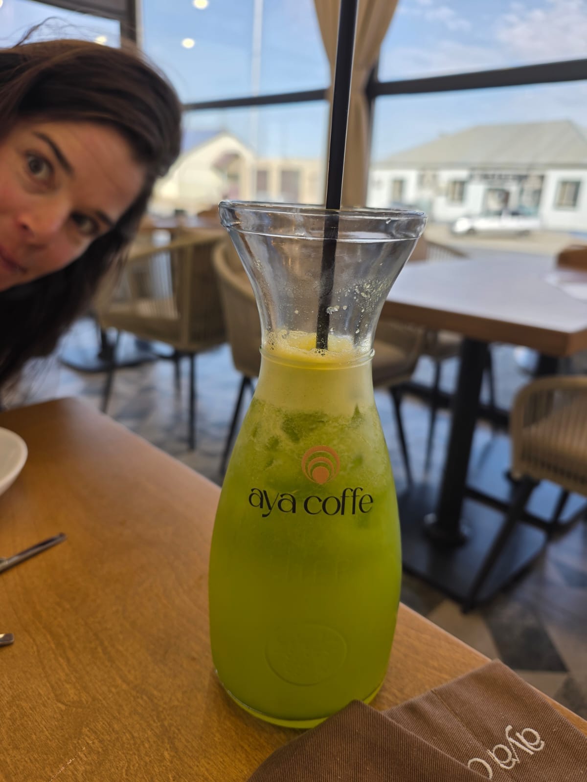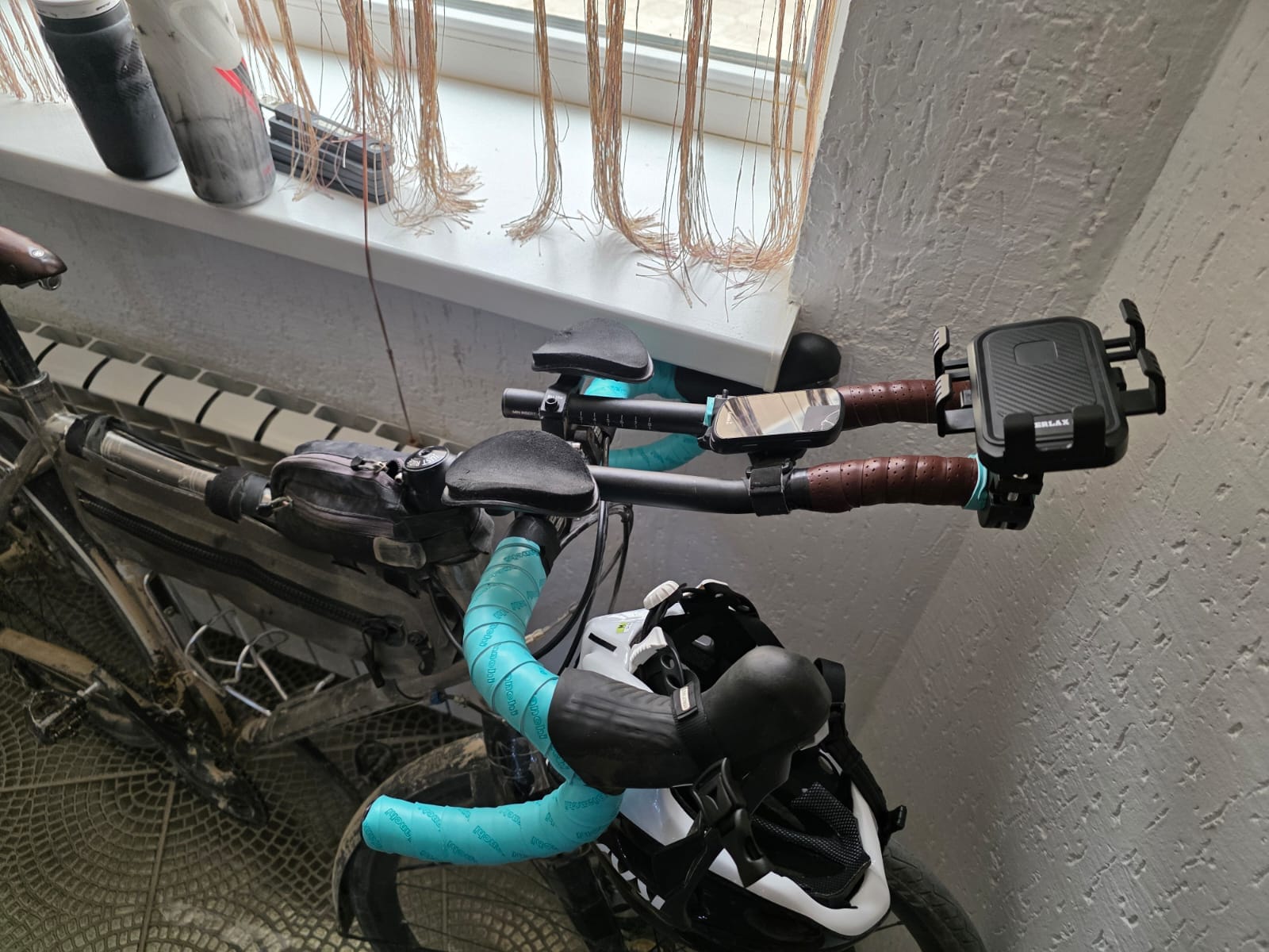 After casually faffing till 1pm, we've both done some bonus faff to get mentally ready for ( / stall the inevitable) the 1500km straight road across Uzbekistan....I've given myself a haircut, Ben's got new bartape and a TV mount on the bars. Just a supermarket shop for supplies, then quick cafe stop for coffee, brunch, check weather and go.